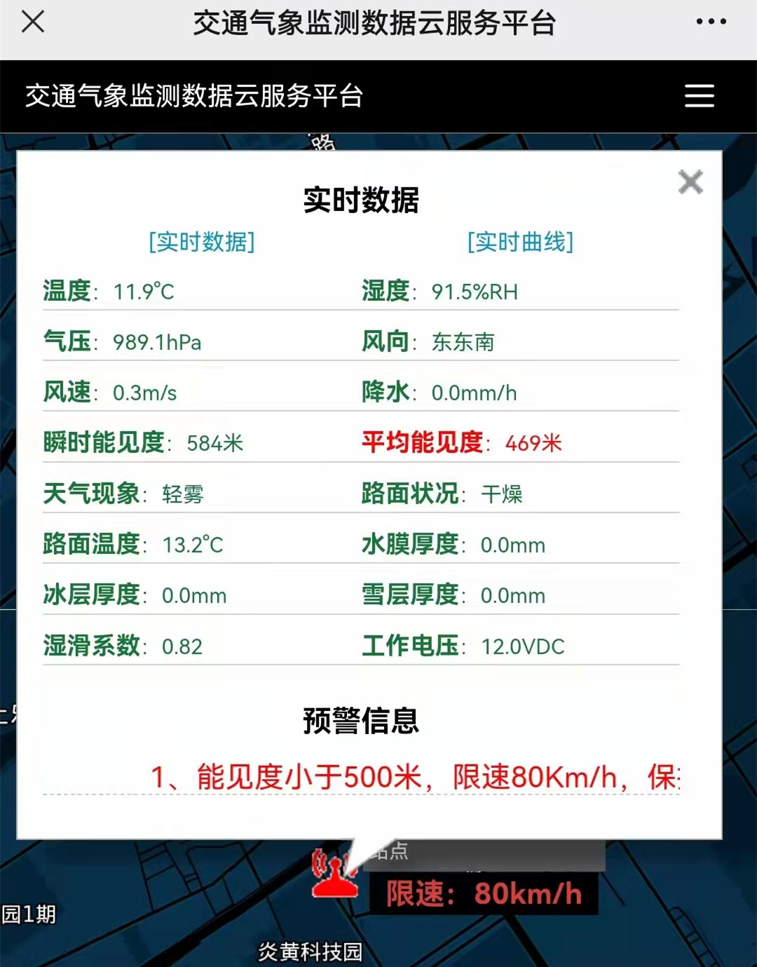 霧天情況下,在實時數據中對于平均能見度會顯示紅色字體,其能見度距離也有具體展現,并提示預警信息:能見度小于多少米,限速多少,保持車距等相關提醒。