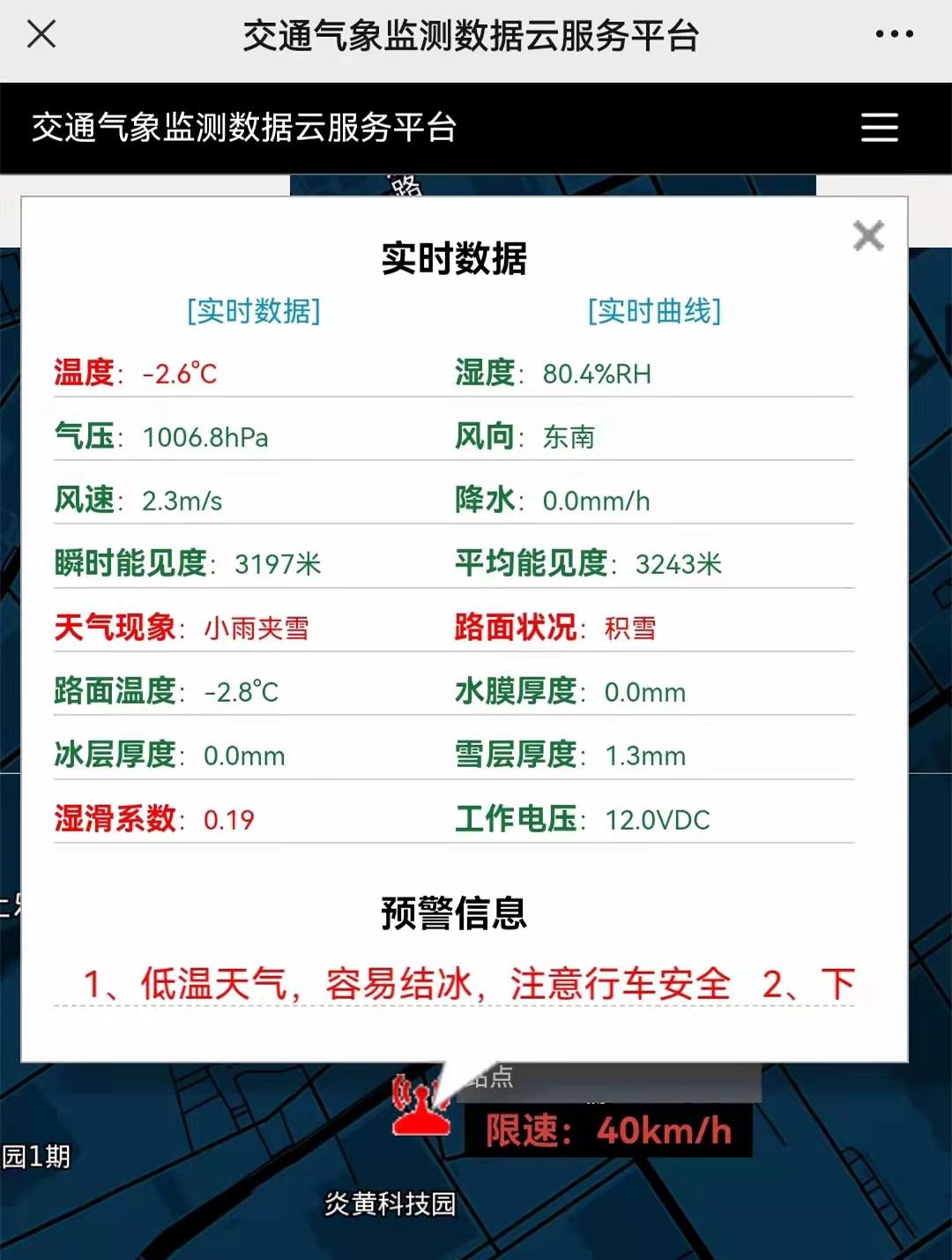 下雪天,在實時數據中的溫度、天氣現象、濕滑系數、路面狀況等數據都會顯示為紅色,并預警提醒:低溫天氣,容易結冰,限速多少等信息。