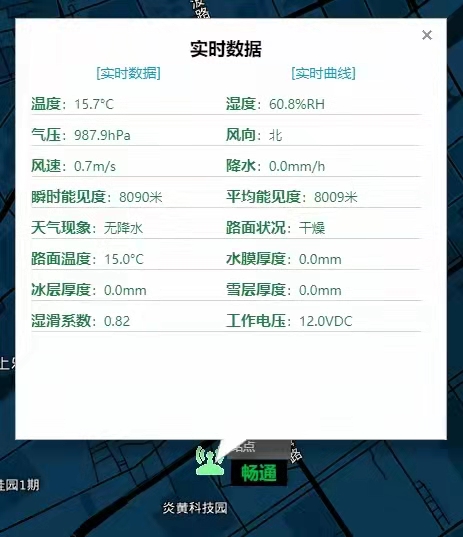 在監測平臺中,實時數據主要展現數據有:溫度、氣壓、風速、瞬時能見度、天氣現象、路面溫度、冰層厚度、濕滑系數、濕度、風向、降水、平均能見度、路面狀況、水膜厚度、雪層厚度、工作電壓等,不同的氣象要素可根據需求進行定制。