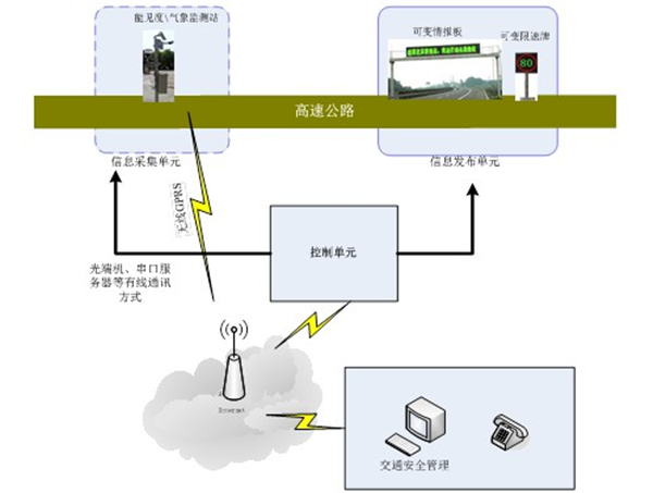 可依托高速公路上已安裝的可變限速標志,根據不同路段檢測的能見距離,實時控制各限速標志的限速值,這樣系統不但可及時提醒駕駛員注意前方大霧,還可向駕駛員安全速度。
